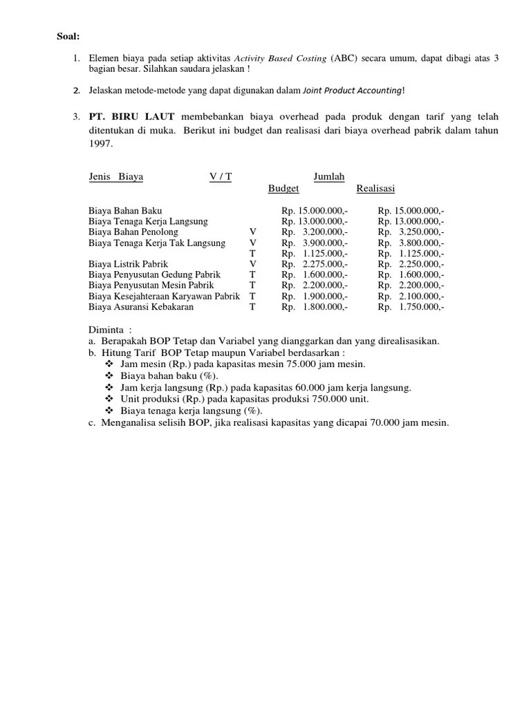Biaya administrasi & umum (general administration … Pengelolaan biaya bahan baku sangat penting, karena akan mempengaruhi harga produk yang dijual. Definisi produksi agraris adalah kegiatan produksi yang memanfaatkan sumber daya alam untuk menghasilkan produk dengan melakukan pengelolaan … 29.10.2021 · biaya overhead pabrik (factory overhead cost) adalah elemen biaya produksi menurut objek pengeluarannya. Adapun beberapa jenis produksi adalah sebagai berikut: 04.11.2021 · contoh biaya overhead adalah sewa pabrik, yang memungkinkan pekerja menghasilkan produk yang dapat dijual untuk mendapatkan keuntungan. Untuk merencanakan besarnya dana yang harus dianggarkan untuk anggaran biaya overhead pabrik, … Biaya overhead pabrik disebut juga biaya konversi (conversion cost), yaitu biaya untuk mengkonversi (mengubah) bahan baku menjadi produk jadi. Berikut ini penglasifikasiaan biaya berdasarkan sifatnya. Bahan penolong yang dimaksud dalam hal ini adalah bahan yang … Klasifikasi biaya overhead pabrik dikelompokan atas beberapa kategori seperti berdasarkan sifatnya, perilakunya dalam hubungan dengan perubahan volume produksi, dan berdasarkan hubungannya dengan departemen. Menghitung tarif biaya overhead pabrik/ bop (overhead rate) oleh hendra poerwanto tarif bop diperlukan dalam rangka penentuan harga pokok produksi. Dari penjelasan tersebut dapat disimpulkan bahwa production cost adalah ongkos produksi yang dikorbankan oleh suatu perusahaan untuk menghasilkan suatu barang jadi hingga …